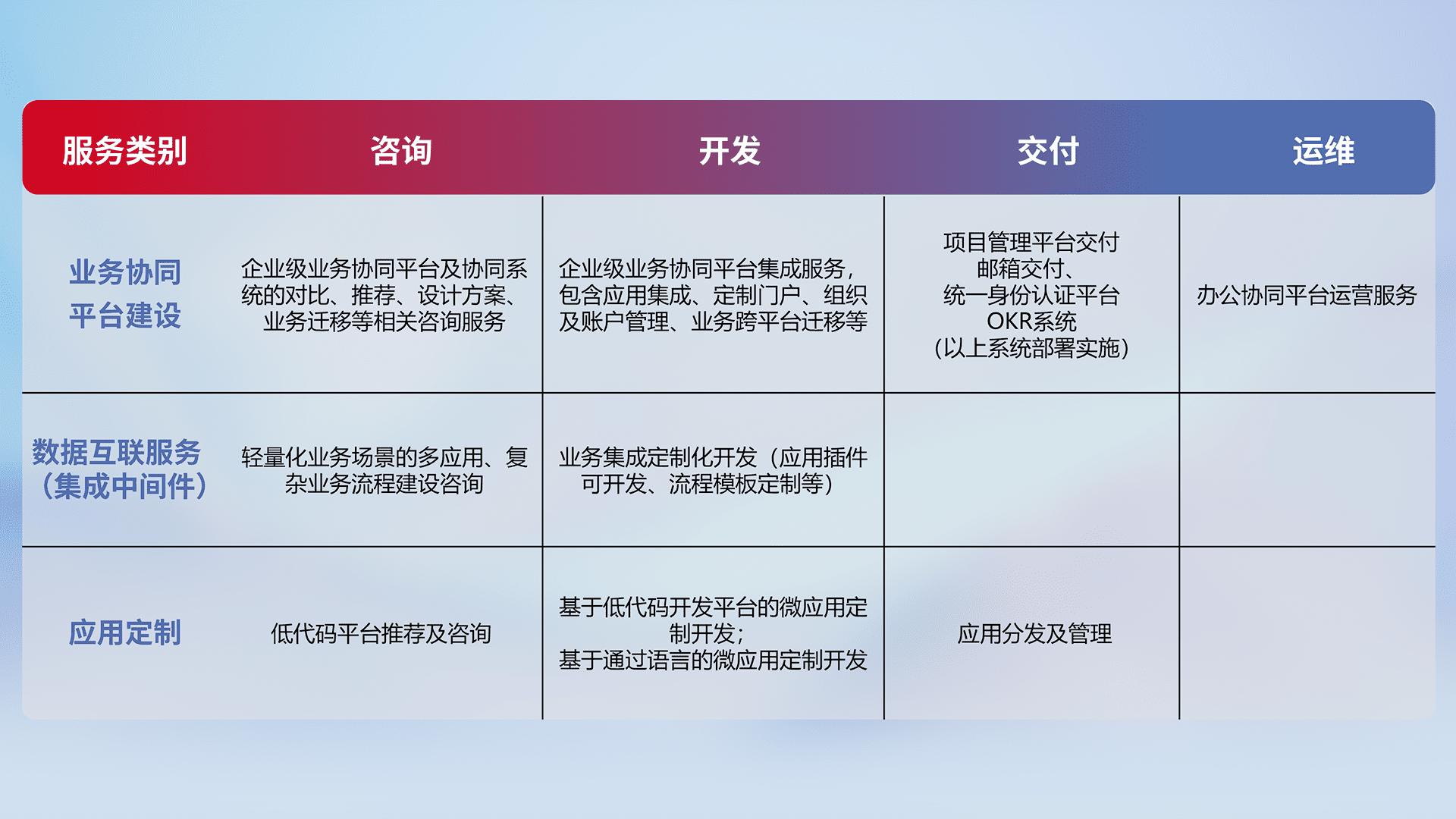 针对钉钉、、、企微、、IDaas等平台级产品提供产品的规划、、、方案、、、交付、、、定制化开发等服务,,,,实现如统一协同办公、、、、智能客户服务、、、混合会议管理、、智能数据查询、、、等业务场景,,,,实现数字化转型。。。。